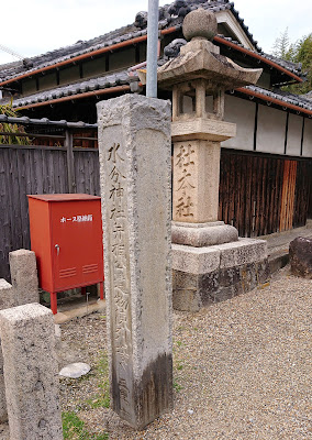 街道沿いの参道入口付近には、現代の各種説明板だけでなく江戸時代の石灯篭など様々な石造物が置かれています。下部が埋まっていて判読できない「水分神社并楠公遺物陳列塲へ三里十...」の石碑は現在の千早赤阪村水分にある建水分神社への距離を表しているのでしょうか(最後は「三里十一町」?)